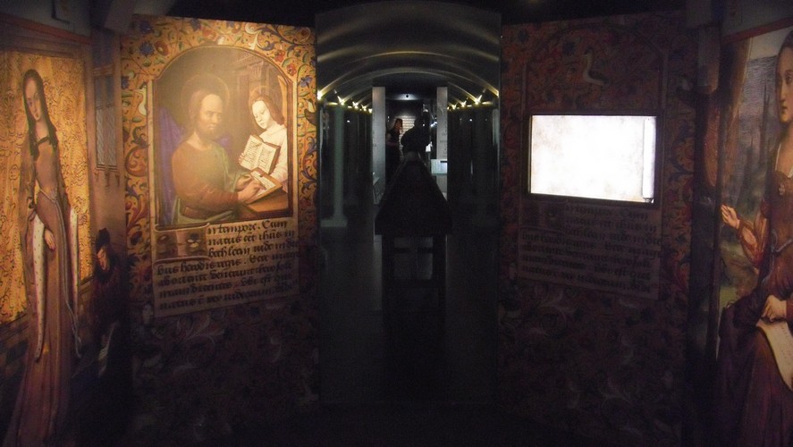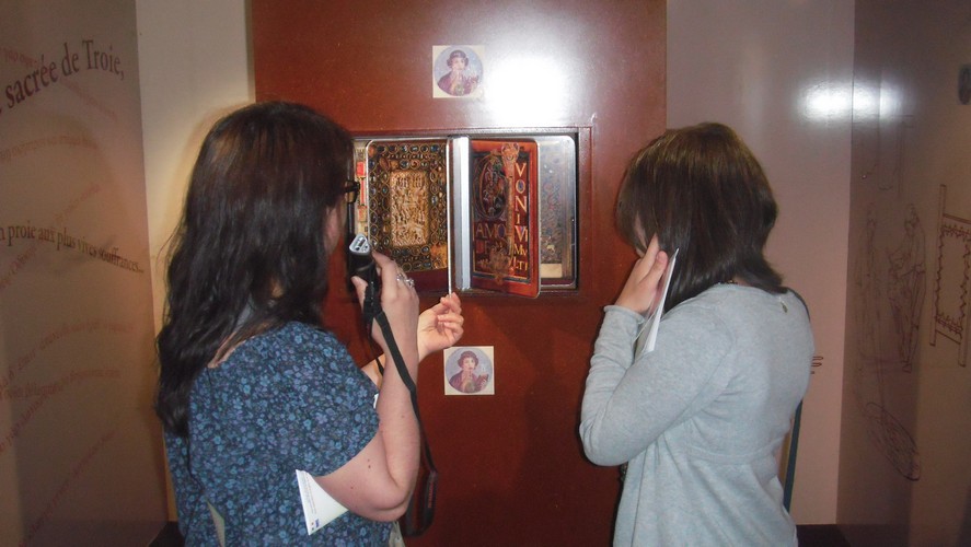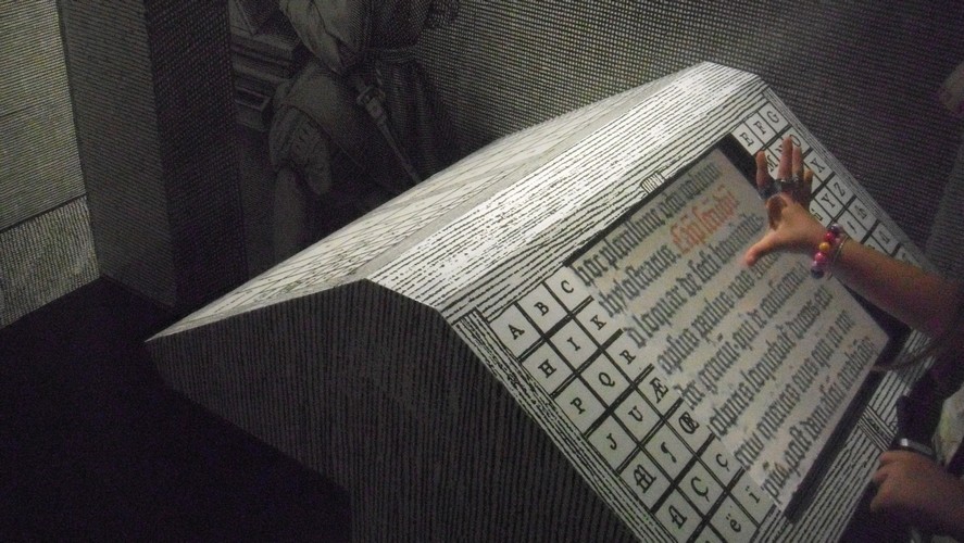 - Cependant, l’exposition manque globalement d’interactivité : des pages factices d’enluminures à tourner, un écran où l’on peut faire défiler la Bible de Gutenberg… et c’est tout. Néanmoins, les enfants ne m’ont pas semblé trop s’ennuyer, du fait que l’exposition se parcoure somme toute rapidement. De plus, des “Je bouquine” leur étaient distribués par le personnel d’accueil à la sortie.