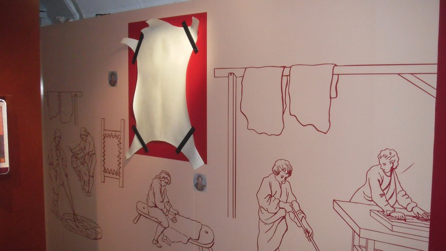 Le train a été compartimenté en différents espaces correspondant à un support donné. Les artefacts muséographiques ne sont pas simplement entreposés dans des vitrines (musée poussière), mais celles-ci sont mises en scène. Tout un décor a été réalisé pour que le visiteur soit immergé ici dans un scriptorium, là dans une imprimerie industrielle, etc. Les scénographes de Skertzo ont réalisé un travail soigné.