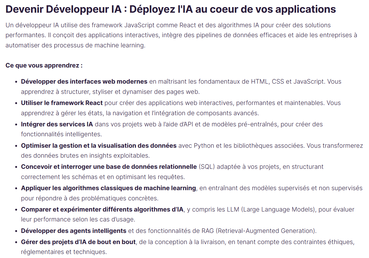 Front, Back et Mobile sont les grands blocs de base, avec un fort accent sur JavaScript. Mais il y a aussi toute une série d’outils. Certains sont incontournables (Bash, GIT, Tests, IA…). D’autres ont un impact plus ou moins direct pour un développeur web. Mais celui-ci gagnerait à les connaitre, au moins dans les grandes lignes (Devops, méthodes agiles…).