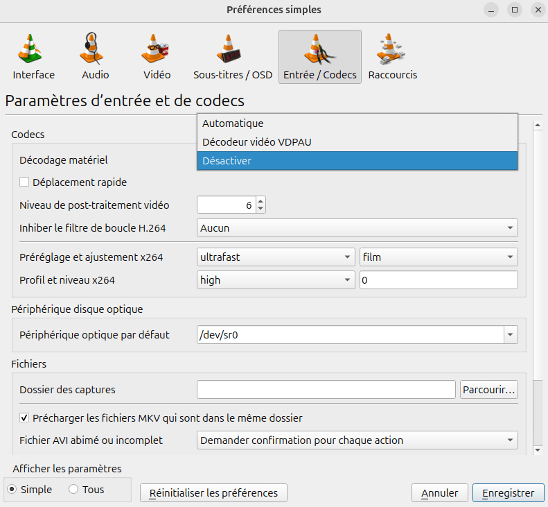 Il faut aller dans les paramètres de VLC et désactiver l’accélération matérielle :