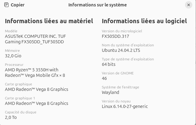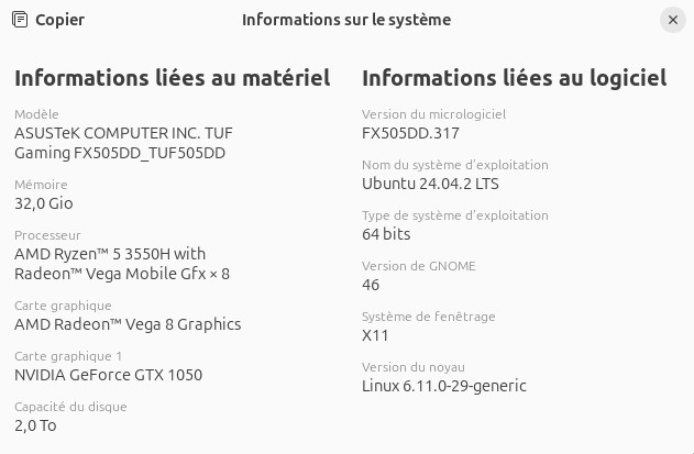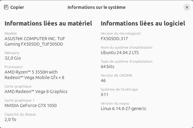 J’ai intérêt à noter quelque part que ma carte graphique est une Nvidia GeForce GTX 1050, et pas une AMD Radeon Vega 8 Graphics ! C’est fou qu’au bout de 18 ans, Wayland ait encore de tels bugs ! J’espère aussi que ma petite manip pour switcher entre X11 et Wayland ne va pas me poser de poser de problème quand je vais passer à Ubuntu 26.04 LTS dans les semaines qui viennent !