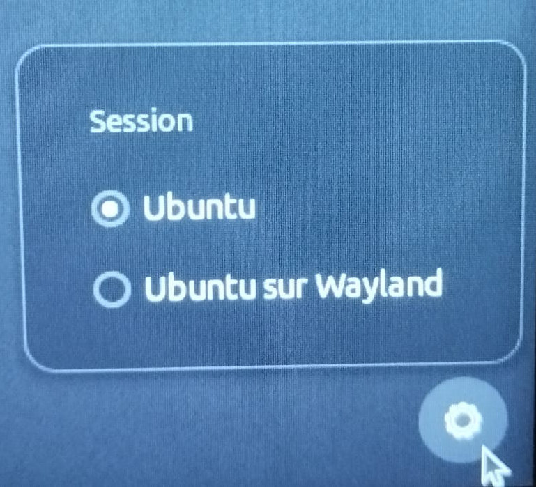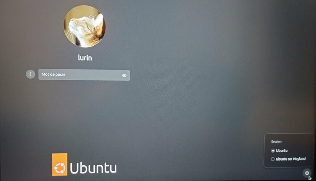A partir de là, un petit engrenage apparaîtra dorénavant en bas à droite de l’écran d’accueil (il faut cliquer dans le champs du mot de passe pour le rendre visible), permettant de switcher entre X11 et Wayland. J’ai testé les deux, mon second écran fonctionne toujours.