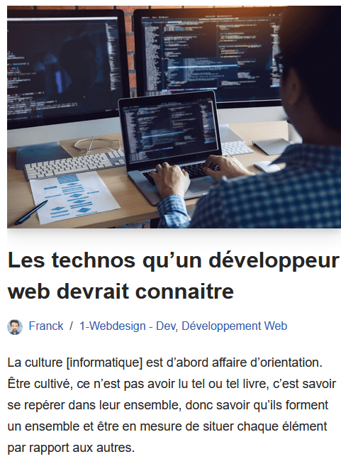 Je continue à me former en autodidacte pour approfondir mes compétences fullstack, initiées avec Express : Linux, TypeScript, NextJS, SQL/NoSQL, Docker, intelligence artificielle… Et ce blog constitue un témoignage de cette nouvelle évolution.